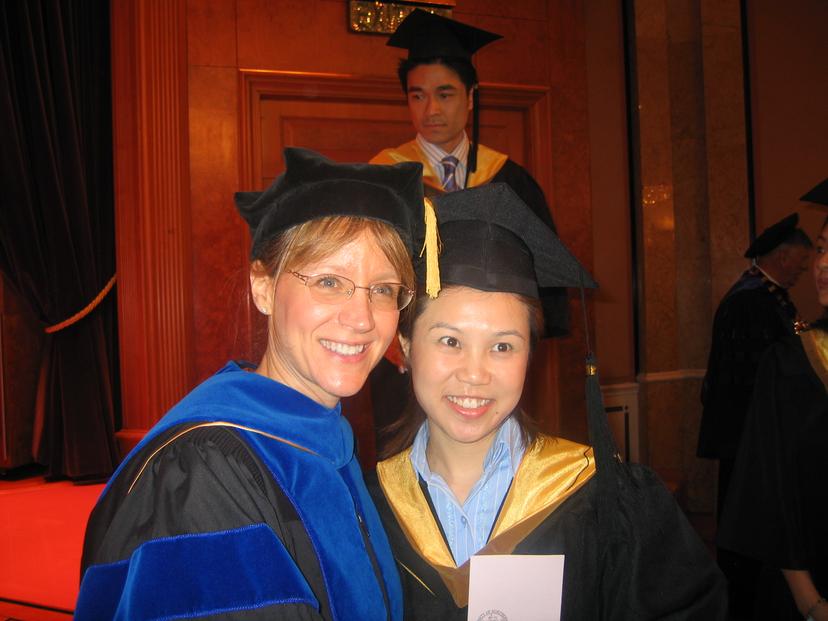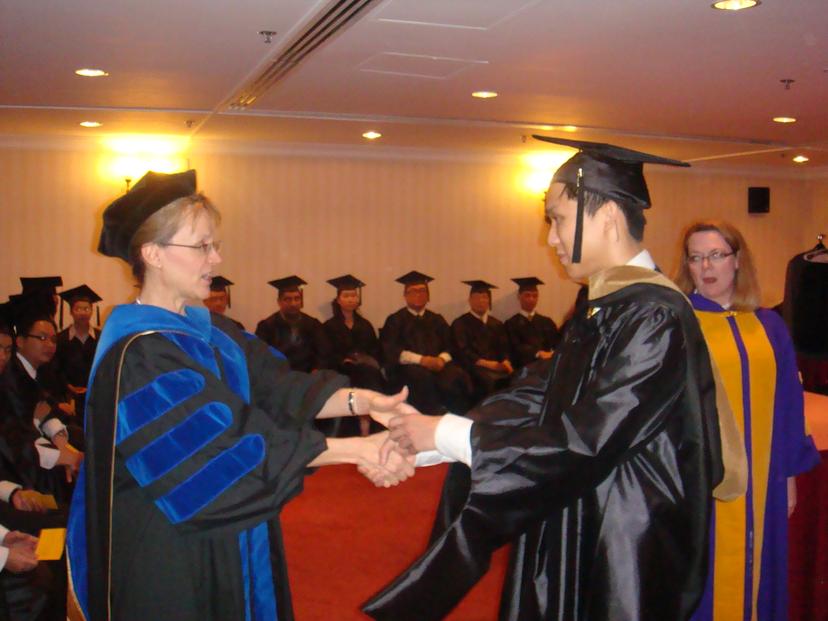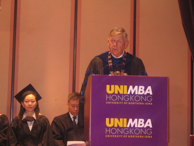 It was Hopkin's big honor to have many UNI senior officials to fly to HK and host the ceremonies, including President Koob in 2006, Dean of Graduate College Dr. Susan Koch in 2006, President Ben Allen in 2008, Head of Management Department Dr. Dale Cyphert in 2008, Provost Gibson in 2010, Prof. Terry Hogan, the Vice President for Student Affairs in 2012, and President William N. Ruud in 2015, etc. Of course, Prof. Moussavi, Director of Global Programs and Bradford Chair in International Business, Dean Dr. Wilson, and the Marchal Nancy and Bob Hoffman were in HK for each of these graduation events.