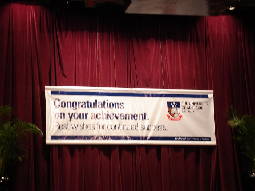 The University of Adelaide HK Graduation Ceremonies from 2004 to 2007 have been held at the Hong Kong Grand Hyatt Hotel. The ceremonies were officiated by Prof. James McWha, the Vice Chancellor of the University. Different university members, including Prof. John Taplin, the Pro-VC (International); Prof. Graham Hubbard, Head of former AGSB; Dr. Georges Baume, MBA Program Director (HK); Mr. M. Llewellyn Smith, Chair of the Alumni Association, Ms. Rosemary Priest; Ms. Kim McBride; Ms. Candance Gibson; and, Ms. Daniela Marschall were also participated in different year's ceremony.