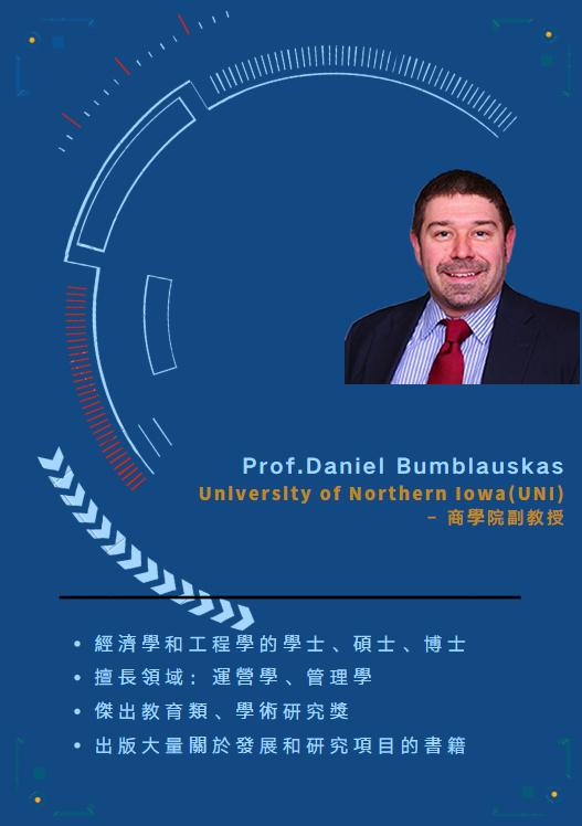 Prof. Daniel Bumblauskas是University of Northern Iowa (UNI)的商學院副教授,是營運學、管理學方面的專家。他於愛荷華州立大學獲取了經濟學和工程學的學士、碩士、博士學位,還曾在哈佛大學修讀!除了擁有深厚的學術根基外,Prof. Bumblauskas 還經常獲邀至公開演講及企業培訓,不愧是營運及管理方面的專家。
