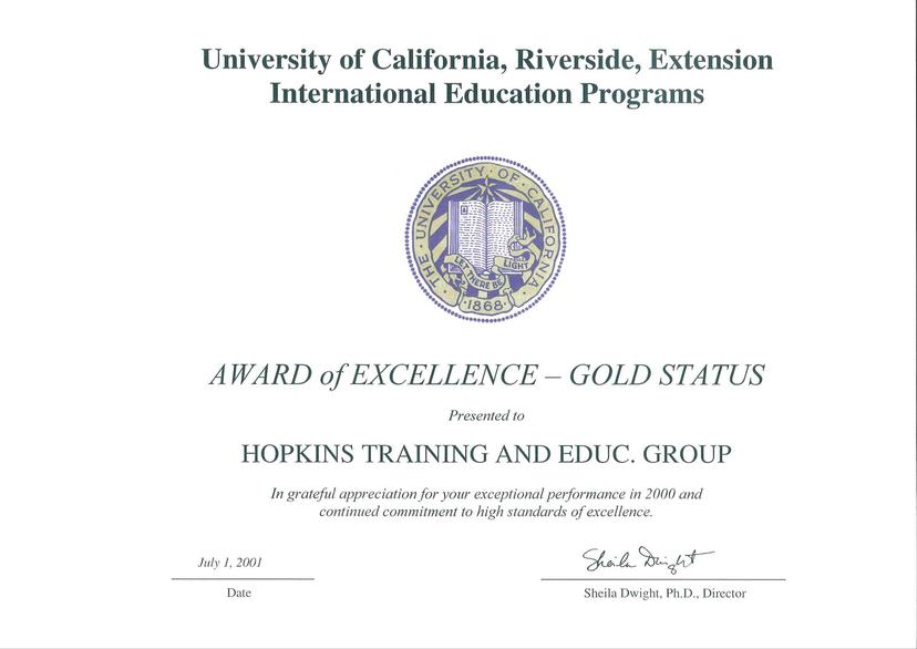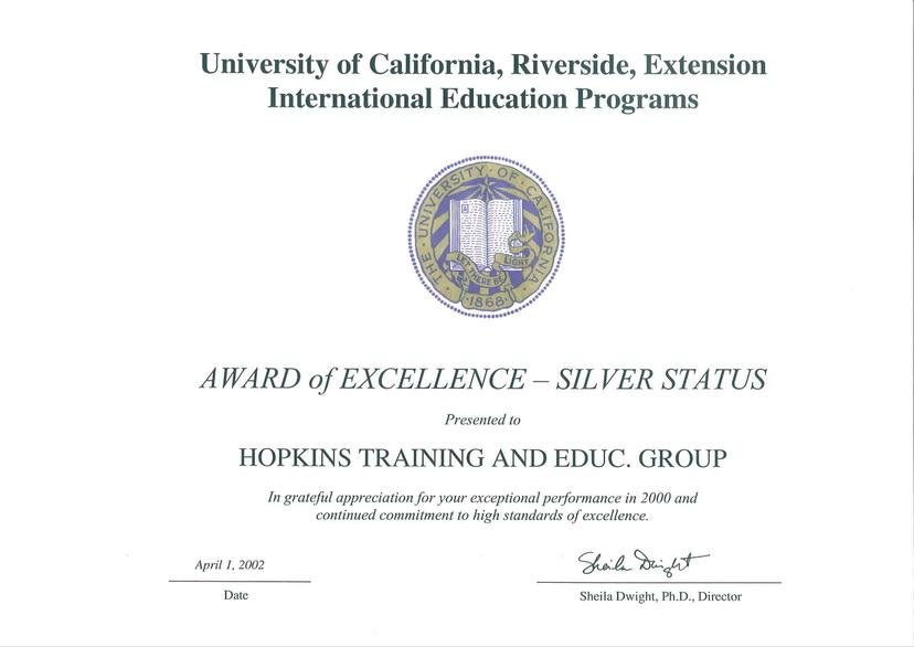 In addition, Hopkins was proud to receiving back-to-back outstanding awards from UCR International Programs Office. We received the Gold Award for Academic Excellence in 2001 and the Silver Award in 2002. The success of the Program was a strong encouragement for us to continue doing our best in the education and training sector.