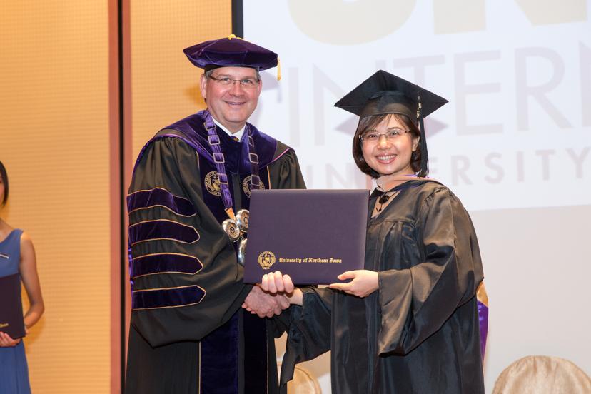 The University of Northern Iowa conferred degrees on MBA candidates during the most recent graduation ceremony held in Hong Kong in June. UNI President William N. Ruud made his first visit to the UNIMBA Hong Kong site and presided at the ceremony.